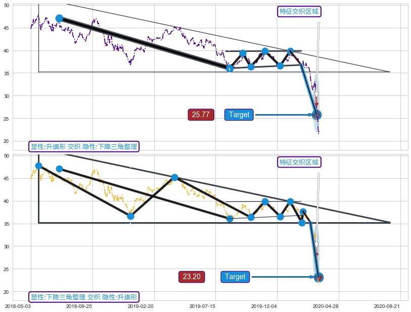 ➣ 下降三角整理:下跌target达成后 → 猜想下跌动能竭尽反转上涨 → 机会信号 → 大趋势均值回复