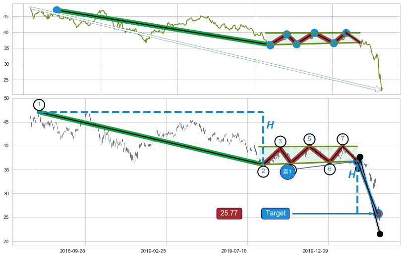 ➣ 升旗形:下跌target达成后 → 猜想下跌动能竭尽反转上涨 → 机会信号 → 大趋势均值回复