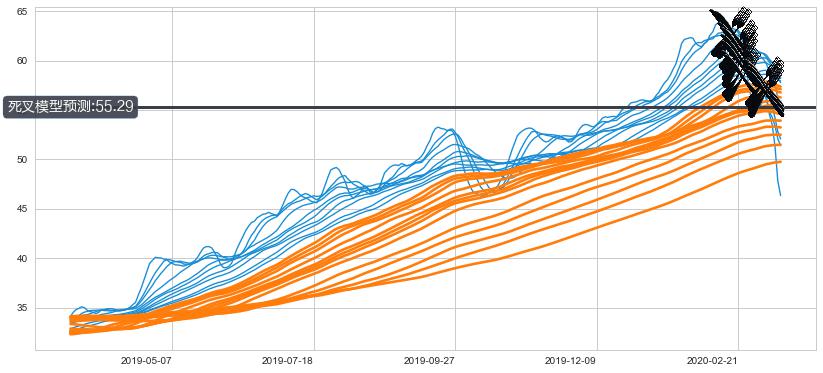 ➣ 60小时均线于(2020-02-24: 58.30)形成【死叉】基于【死叉历史模型】预测死叉后最低波谷价格: 55.23, 死叉后最低价格40.06,已经下跌超出预测最低波谷价格, 预期反弹