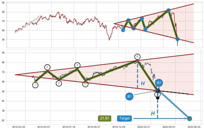 ➣ 扩散三角反转:下行突破支撑位破位, 猜想持续下沉下跌,被突破的支撑位已变为阻力位