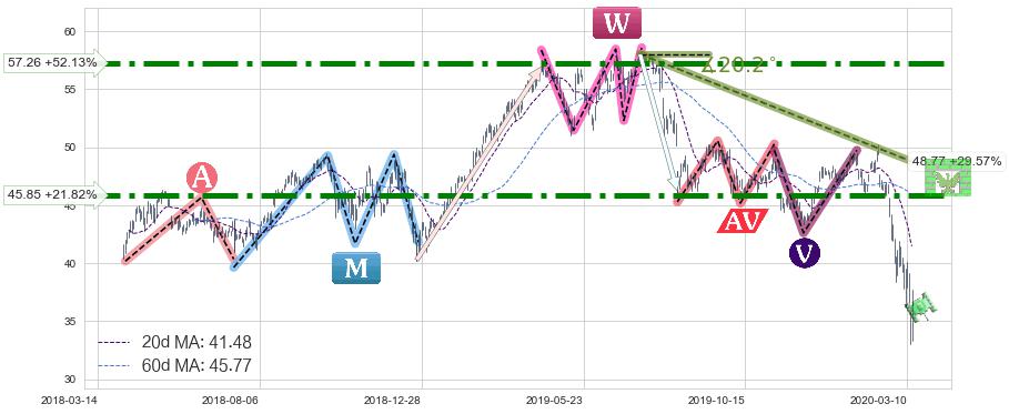 ♘ 阻力价格位45.85,可信任强度88.18%,距离最后交易2020-03-13形成的收盘价格37.64相差 +21.82%