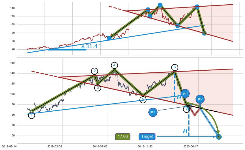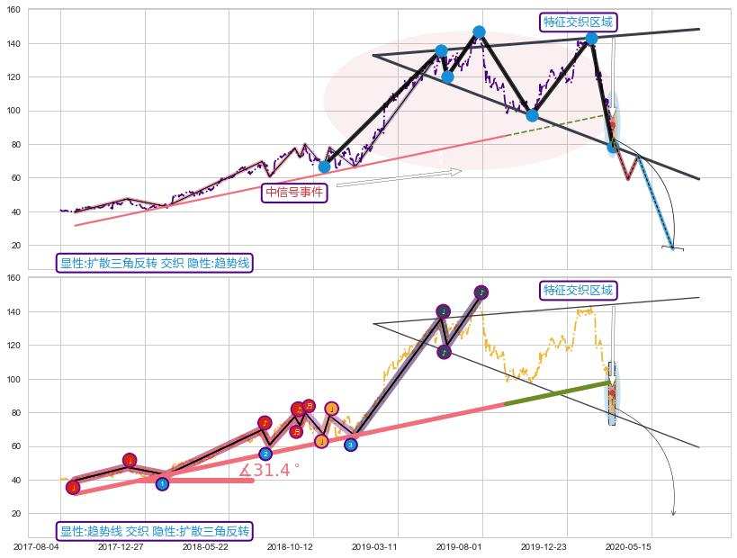 ➣ 扩散三角反转:猜想临近关键支撑位突破点 → 临近拐点下跌 → 风险信号 → 大趋势均值回复