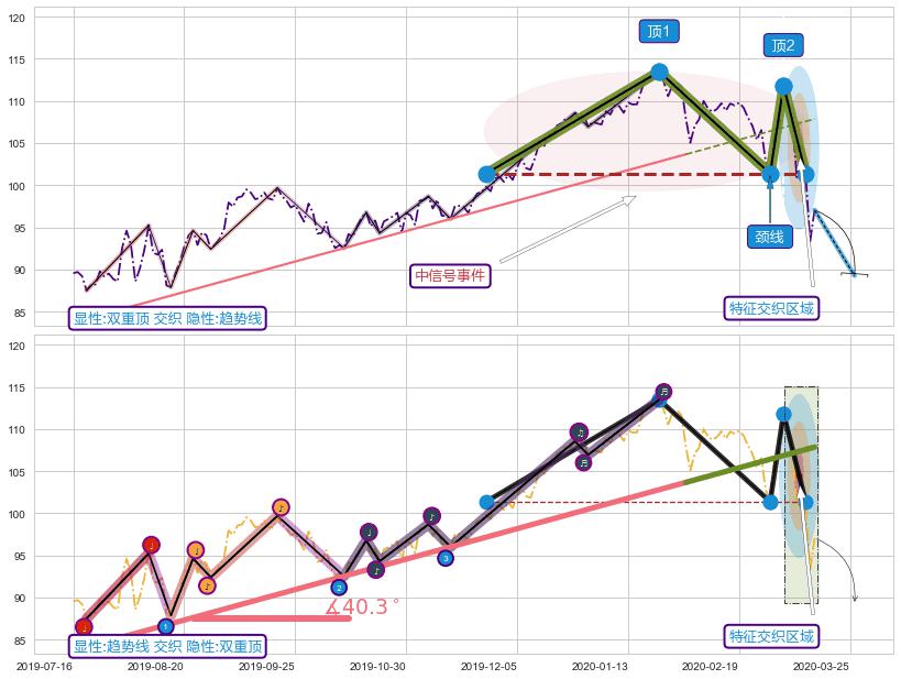 ➢ 双重顶属【短级别信号事件】升楔型属【长级别信号事件】长短周期组合信号事件, 短长事件长度比18.43%