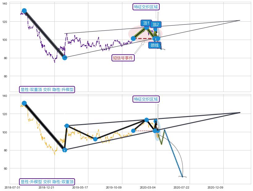 ➢ 双重顶:关键支撑位被击穿 → 猜想形成趋势持续下跌 → 风险信号 → 大趋势均值回复