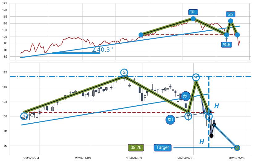 ➣ 双重顶:关键支撑位被击穿 → 猜想形成趋势持续下跌 → 风险信号 → 大趋势均值回复
