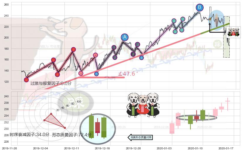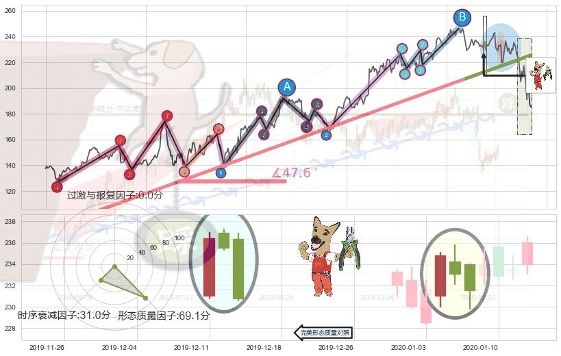 ➢ 2018-04-30-2019-12-09上升趋势存在反转[风险],其原上升趋势的支撑位(225.48)已破位[强阻力信号],原上升趋势角度: 47.6˚