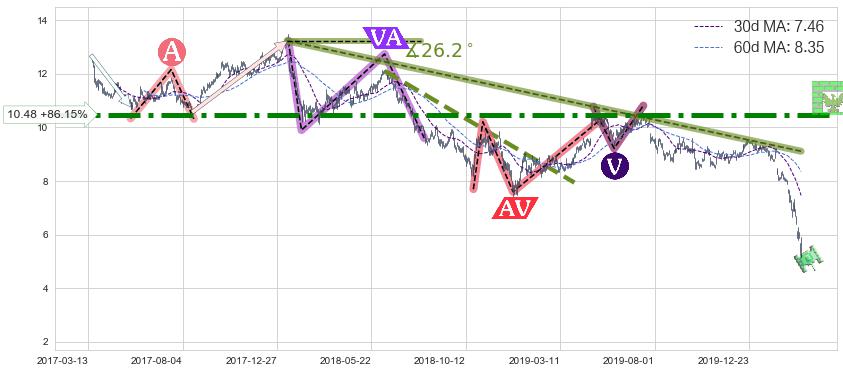 ➢ 【多方力量耗尽,空方打破攻守平衡点】下降三角形中继整理, 已在2020-02-06突破【支撑】颈线 8.29 →演变成下降通道