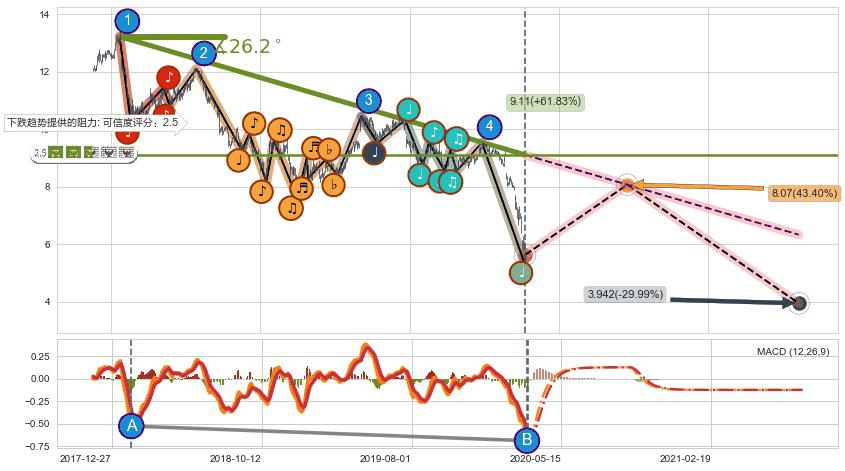 ♘ 在最后的下跌阶段2018-01-12至2020-03-13,存在 持续未破位的阻力位 ,阻力价格9.11,可信任强度66.63%,其距离最后价格5.63相差 +61.83%