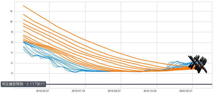 ➣ 90小时均线于(2020-03-11: 1.4204)形成【死叉】基于【死叉历史模型】预测死叉后最低波谷价格: -2.6851502, 死叉后最低价格1.0900,尚未达到预测最低波谷价格, 预期继续下跌