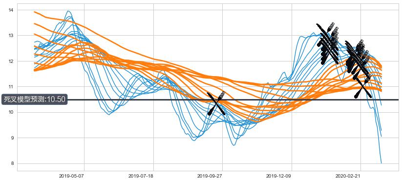 ➣ 180小时均线于(2020-02-24: 10.99)形成【死叉】基于【死叉历史模型】预测死叉后最低波谷价格: 8.47, 死叉后最低价格7.17,已经下跌超出预测最低波谷价格, 预期反弹