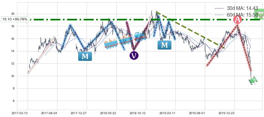 ♘ 阻力价格位19.10,可信任强度89.58%,距离最后交易2020-03-13形成的收盘价格10.01相差 +90.78%