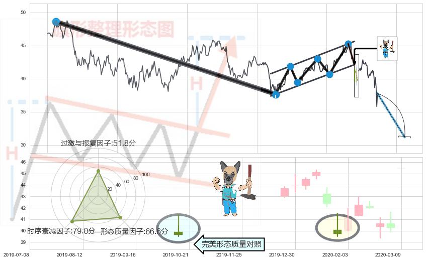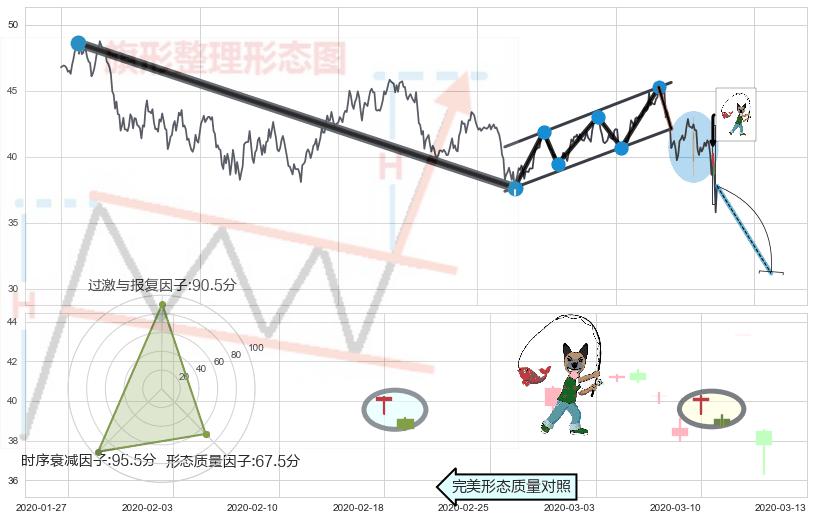 ➢ 下降插入线(坠落线) 🔜 升旗形支撑破位转换阻力下跌 综合量化分数:43.37 【偏空】