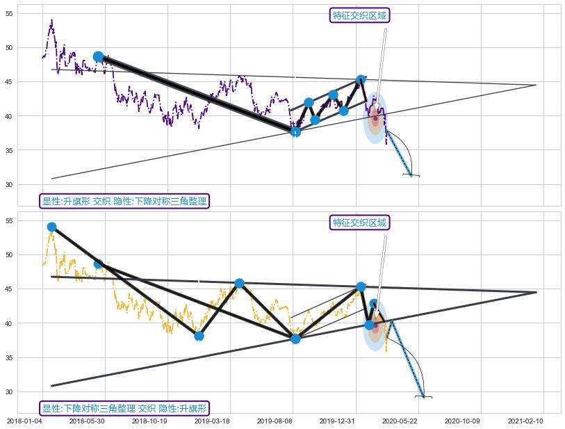 ➢ 下降对称三角整理:下行突破支撑位破位, 猜想持续下沉下跌,被突破的支撑位已变为阻力位