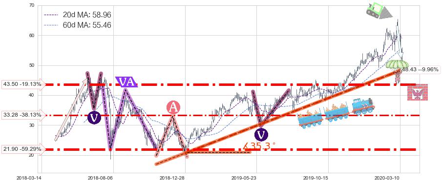 ♘ 支撑价格位43.50,可信任强度88.37%,距离最后交易2020-03-13形成的收盘价格53.79相差 -19.13%