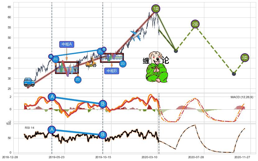 ➣ 缠论买卖点:上升缠中枢AB形成后猜想拐点1卖已到达,猜想后续持续下跌(均值回复)