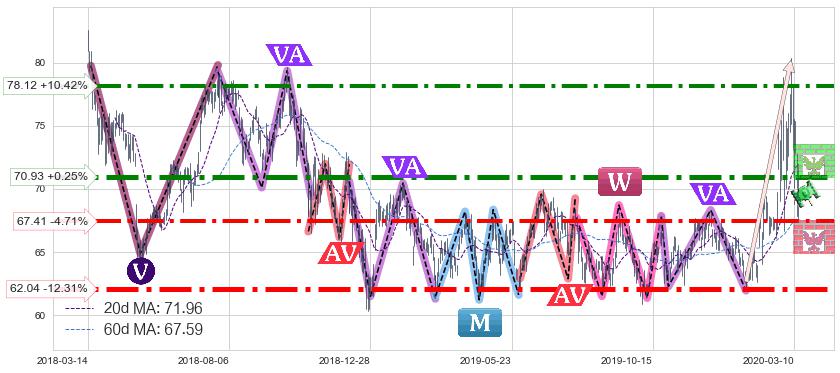 ♘ 支撑价格位62.04,可信任强度99.00%,距离最后交易2020-03-13形成的收盘价格70.75相差 -12.31%