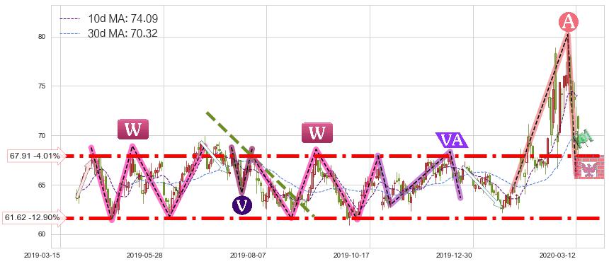 ♘ 支撑价格位67.91,可信任强度88.80%,距离最后交易2020-03-13形成的收盘价格70.75相差 -4.01%