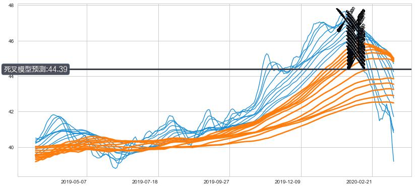 ➣ 75小时均线于(2020-02-04: 45.66)形成【死叉】基于【死叉历史模型】预测死叉后最低波谷价格: 43.48, 死叉后最低价格36.51,已经下跌超出预测最低波谷价格, 预期反弹