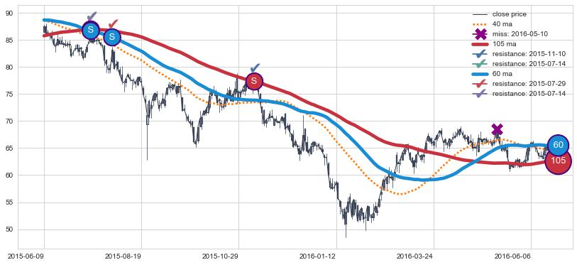 ➢ 最优均线组合共正确确认支撑阻力信号9处,正确确认率 45.00%