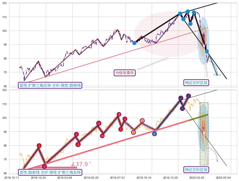 ➣ 扩散三角反转:关键支撑位被击穿 → 猜想形成趋势持续下跌 → 风险信号 → 大趋势均值回复