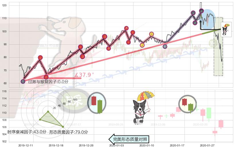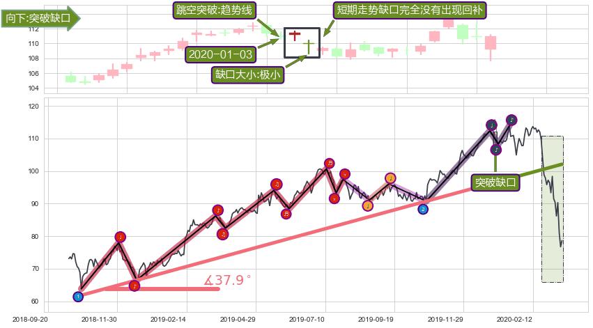 ➢ 2018-10-24-2020-01-24上升趋势存在反转[风险],其原上升趋势的支撑位(102.11)已破位[强阻力信号],原上升趋势角度: 37.9˚
