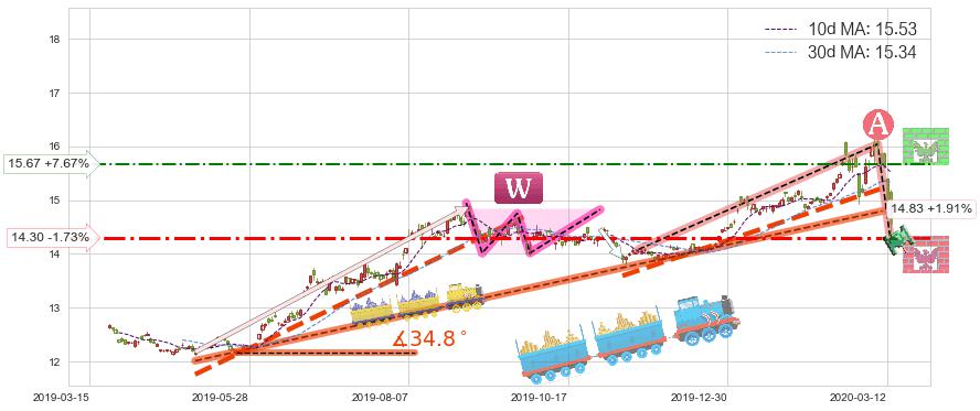 ♘ 支撑价格位14.30,可信任强度66.03%,距离最后交易2020-03-13形成的收盘价格14.55相差 -1.73%