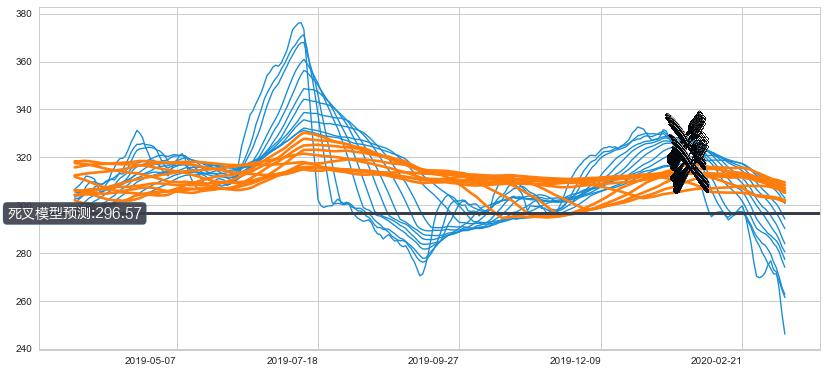 ➣ 70小时均线于(2020-01-24: 316.91)形成【死叉】基于【死叉历史模型】预测死叉后最低波谷价格: 288.35, 死叉后最低价格223.28,已经下跌超出预测最低波谷价格, 预期反弹
