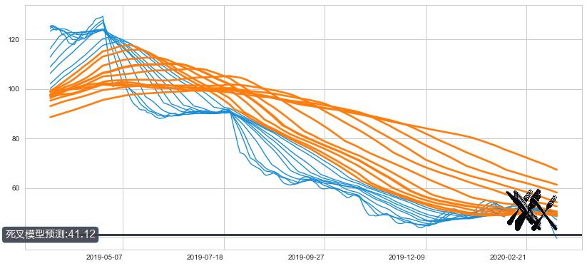 ➣ 70小时均线于(2020-02-21: 49.60)形成【死叉】基于【死叉历史模型】预测死叉后最低波谷价格: 39.14, 死叉后最低价格36.92,虽然已经到达预测最低波谷价格,但耗时间很短动能很强, 预期继续下跌