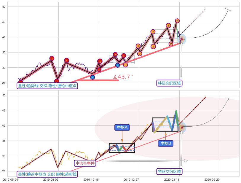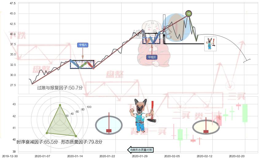 ➣ 【中枢B】:2020-01-22-2020-02-06,中枢由5笔构成,共12交易日, ZG=39.14, ZD=37.69