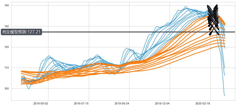 ➣ 90小时均线于(2020-02-21: 132.94)形成【死叉】基于【死叉历史模型】预测死叉后最低波谷价格: 125.91, 死叉后最低价格88.05,已经下跌超出预测最低波谷价格, 预期反弹
