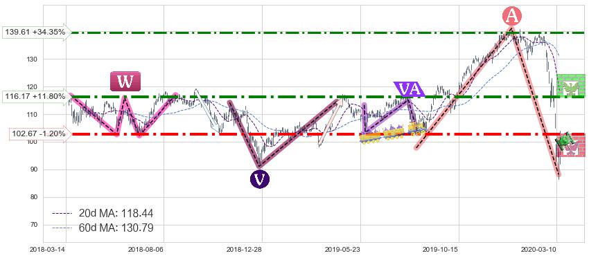 ♘ 支撑价格位102.67,可信任强度84.38%,距离最后交易2020-03-13形成的收盘价格103.91相差 -1.20%