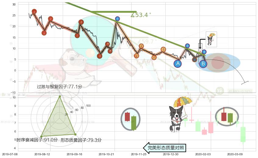 从2018-03-15至2020-03-13,共包含503个交易日,阶段股价下跌-68.85%,阶段股价变动位移路程比: 1 : 27,下跌趋势角度: 53.4