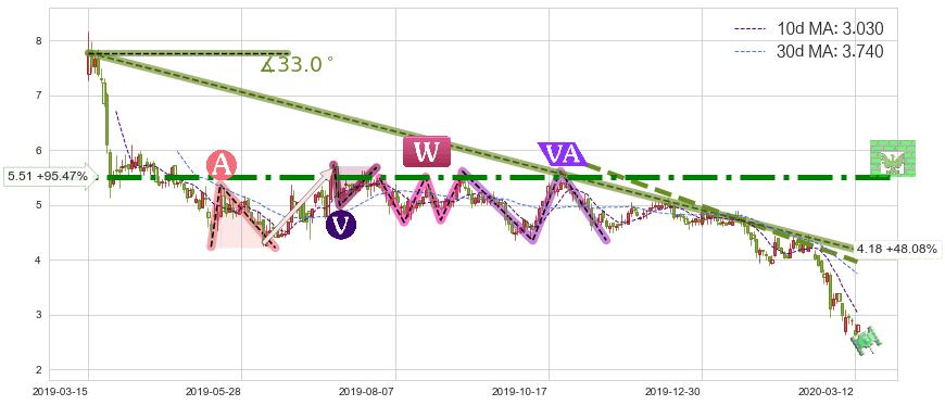 从2019-03-15至2020-03-13,共包含252个交易日,阶段股价下跌-87.30%,阶段股价变动位移路程比: 1 : 6,下跌趋势角度: 33.0