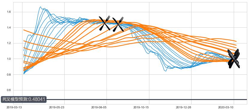 ➢ 120小时均线于(2019-08-22: 1.4348)形成【死叉】基于【死叉历史模型】预测死叉后最低波谷价格: 0.8257, 死叉后最低价格0.8000,已经下跌超出预测最低波谷价格, 预期反弹