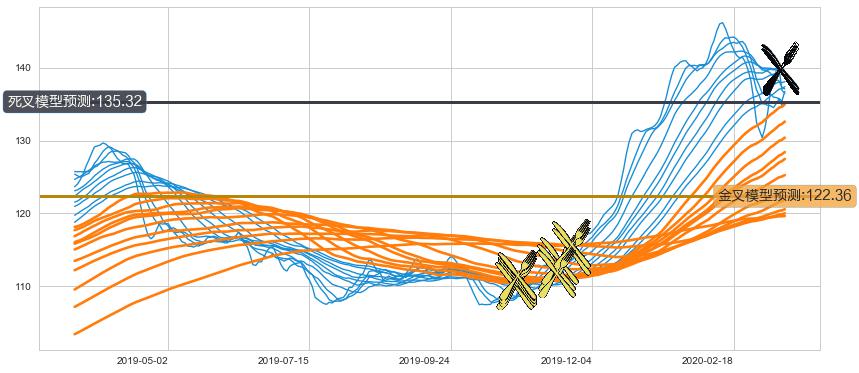 ➢ 40小时均线于(2020-03-11: 139.93)形成【死叉】基于【死叉历史模型】预测死叉后最低波谷价格: 135.60, 死叉后最低价格126.02,已经下跌超出预测最低波谷价格, 预期反弹