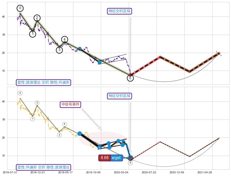 ➢ 升旗形target支撑拐点上涨 🔜 波浪理论下跌浪:浪5反弹拐点 综合量化分数:58.65 【偏多】