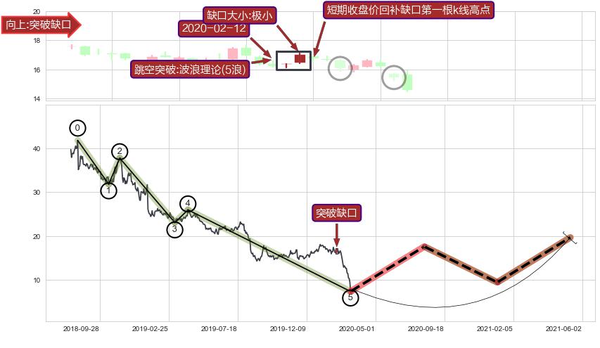 ➢ 突破缺口形成后,后续k已经超过14根,跳空突破波浪理论(5浪)关键点后, 出现【完全回踩】迹象,短期收盘价回补缺口第一根k线高点
