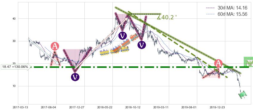 从2018-06-07至2020-03-13,共包含445个交易日,阶段股价下跌-140.68%,阶段股价变动位移路程比: 1 : 6,下跌趋势角度: 40.2