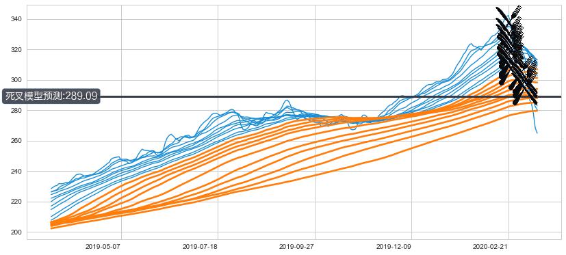 ➢ 70小时均线于(2020-02-24: 306.83)形成【死叉】基于【死叉历史模型】预测死叉后最低波谷价格: 288.50, 死叉后最低价格241.50,已经下跌超出预测最低波谷价格, 预期反弹