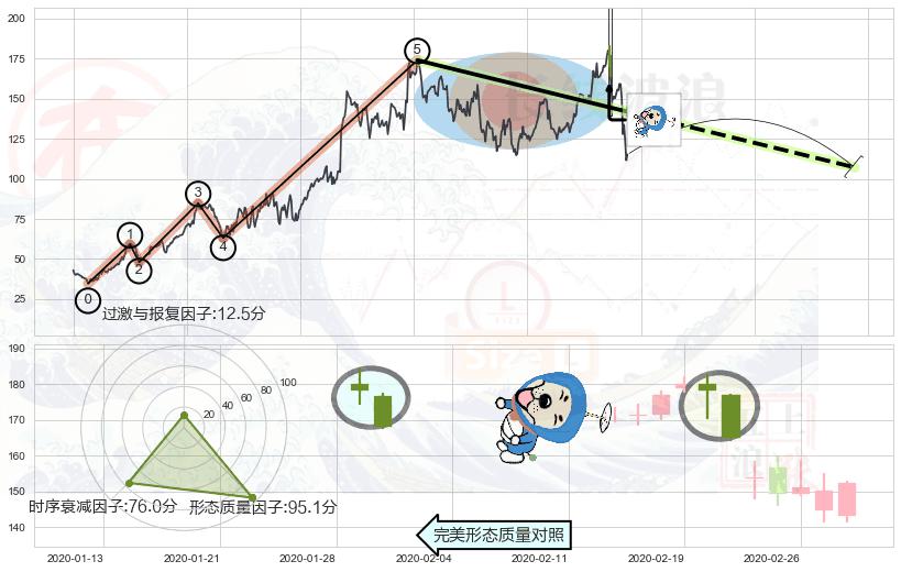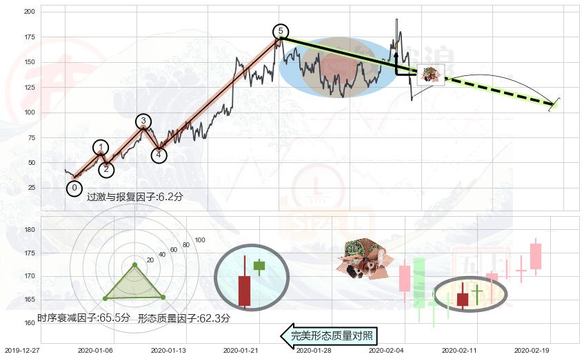 ➢ 顶部尽头线(下山虎) + 波浪理论上涨浪:浪5回调拐点信号叠加后【反向回撤率】低,【看空】信号叠加【存续影响大】