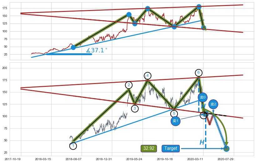 ➢ 扩散三角反转:猜想临近关键支撑位突破点 → 临近拐点下跌 → 风险信号 → 大趋势均值回复