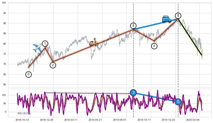➣ 第三,五驱动浪端点:【KDJ】走势出现【常规背离 & 反转信号】背离程度99.00%,背离夹角角度48.4˚,背离程度较大