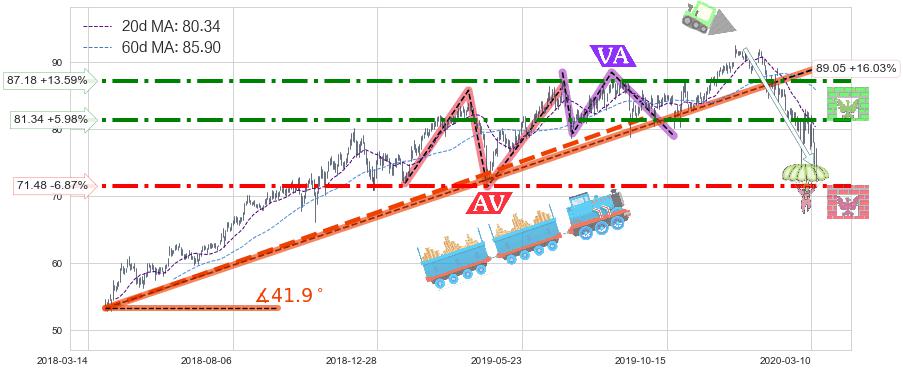 ♘ 阻力价格位87.18,可信任强度79.47%,距离最后交易2020-03-13形成的收盘价格76.75相差 +13.59%