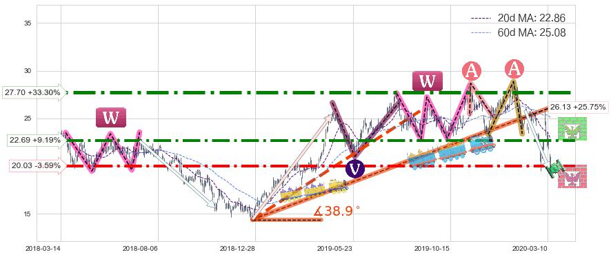 ♘ 支撑价格位20.03,可信任强度73.83%,距离最后交易2020-03-13形成的收盘价格20.78相差 -3.59%