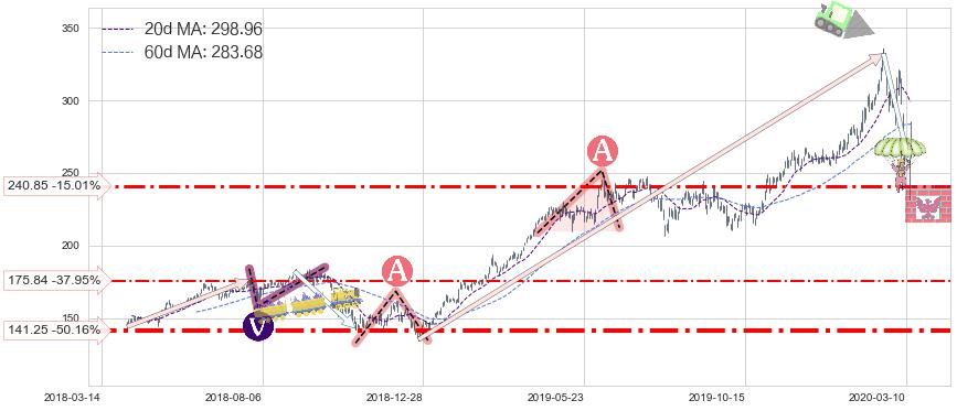 ♘ 支撑价格位240.85,可信任强度64.84%,距离最后交易2020-03-13形成的收盘价格283.40相差 -15.01%
