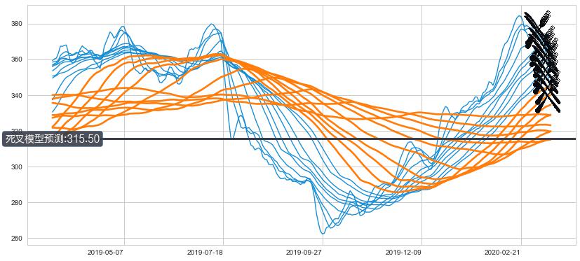 ➣ 60小时均线于(2020-03-10: 349.81)形成【死叉】基于【死叉历史模型】预测死叉后最低波谷价格: 313.95, 死叉后最低价格315.25,尚未达到预测最低波谷价格, 预期继续下跌