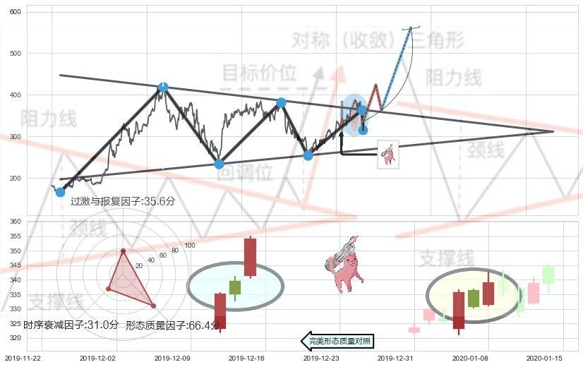 ➣ 旭日东升 + 上升对称三角整理临近阻力猜想转换支撑上涨信号叠加后【目标达成率】中等,【看多】信号叠加【存续影响中等】