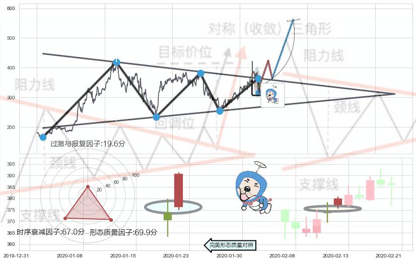 ➣ AI智能: 预测【多空区域上下窄幅震动→价格波动日益狭窄→多方占优】对称三角形中继整理向上突破,预测将在2020-03-25突破颈线, 演变成上升通道