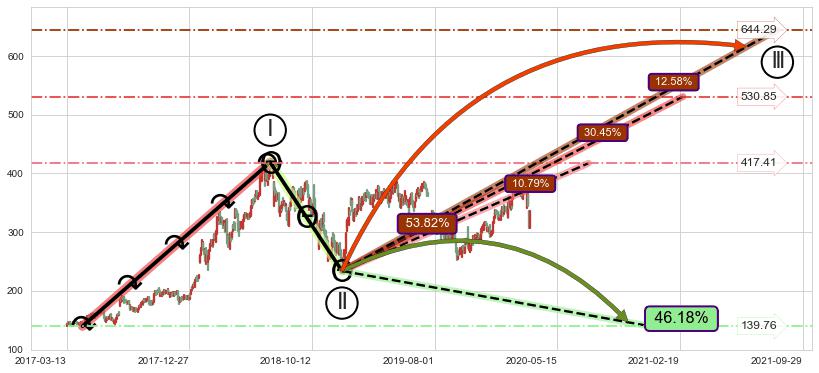 ➣ 循环浪继续向上【平均值】位置(2021-02-26, 530.85),匹配聚类样本比例56.57%, 可能性概率30.45%