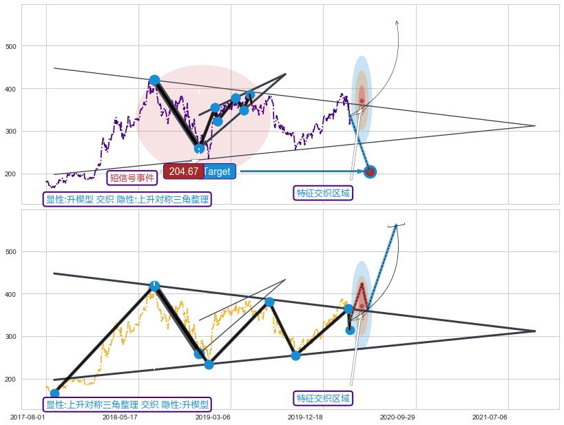 ➣ 上升对称三角整理:猜想临近关键阻力位突破点 → 临近拐点上涨 → 机会信号 → 大趋势均值回复